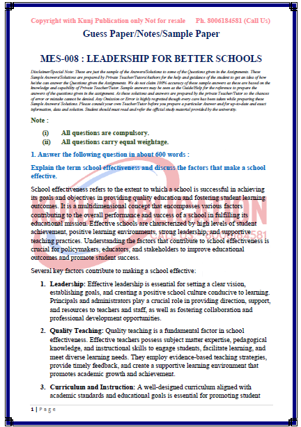 TITLE NAME MES-008 Solved Guess Paper ENGLISH MEDIUM