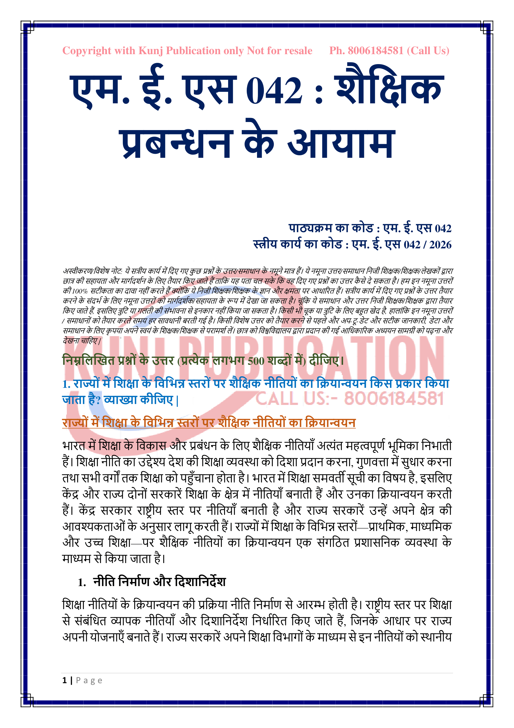 IGNOU MES-042 SOLVED ASSIGNMENT JAN-JULY 2026 HINDI MEDIUM