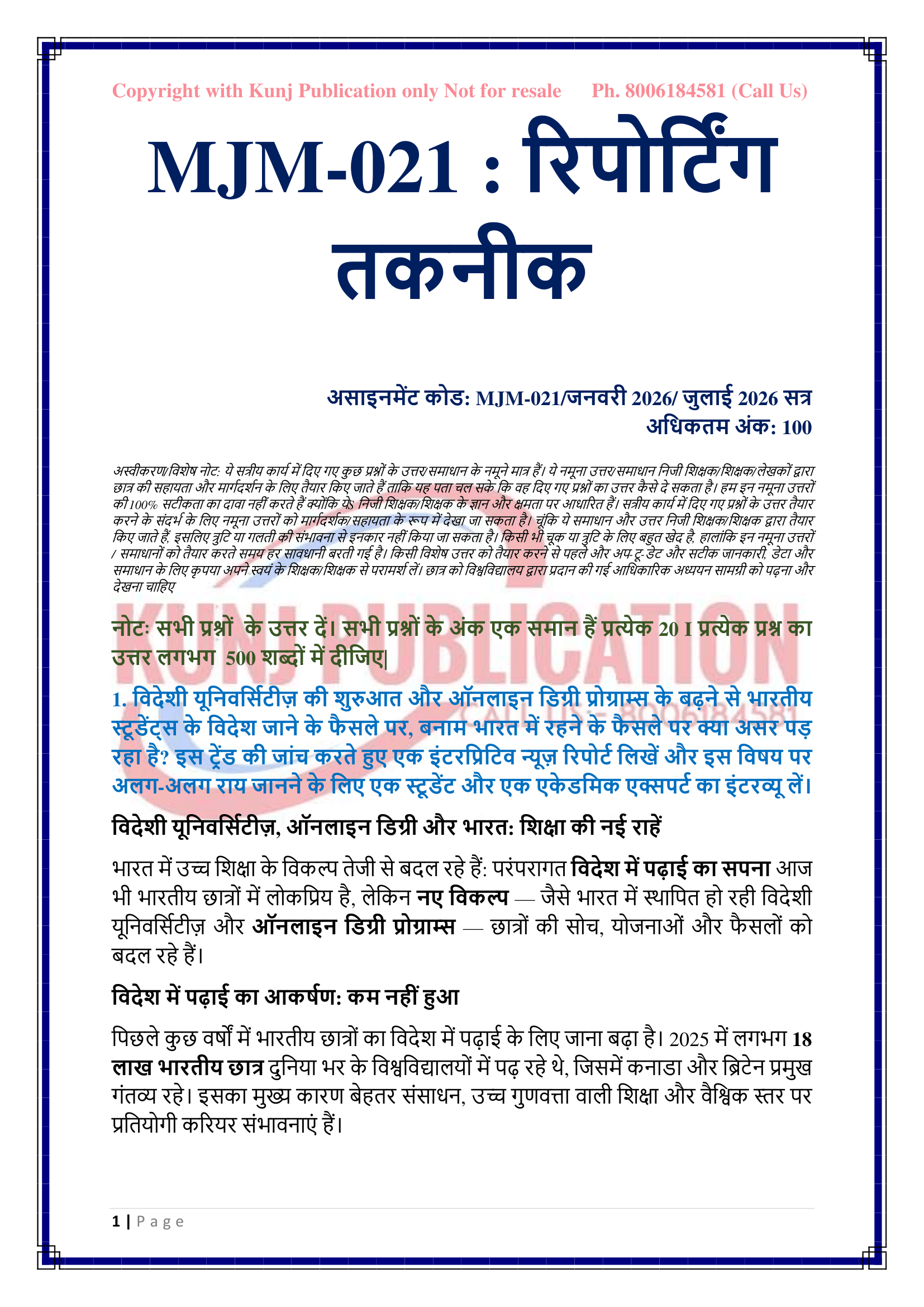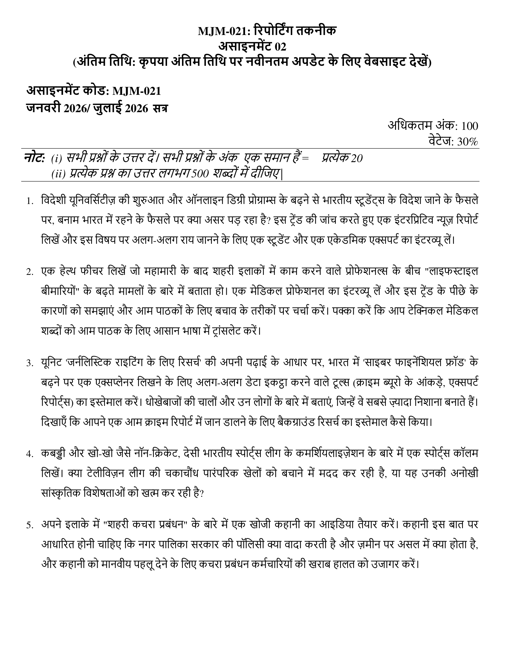 IGNOU MJM-021 SOLVED ASSIGNMENT JAN 2026 – JULY 2026 HINDI MEDIUM